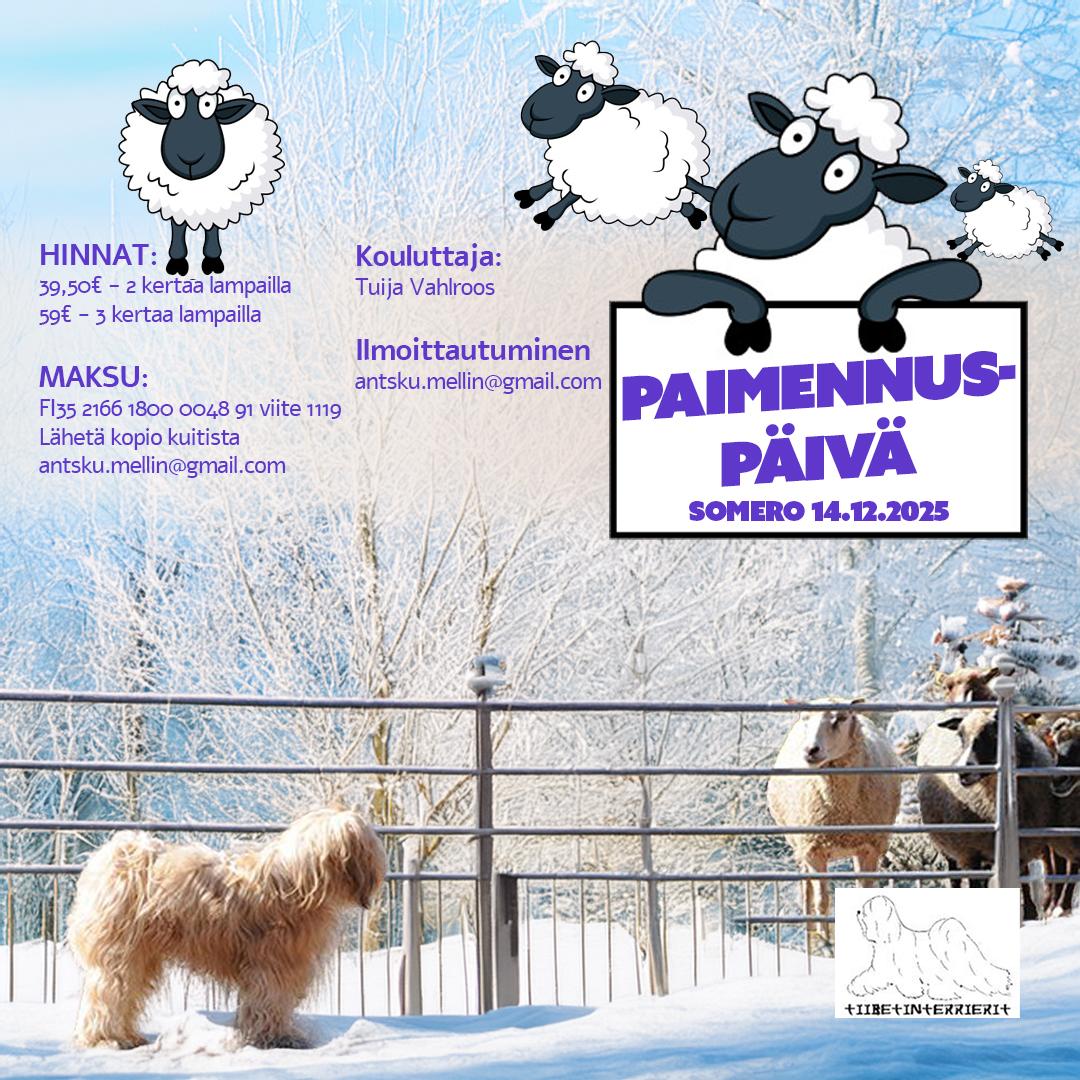 PAIMENNUSTA SOMEROLLA Su 16.2.2025 - Kouluttajana tuttu Tuija Vahlroos. - Päivän hinta on 39,50 € (koira 2 kertaa lampailla) tai 59 € (koira 3 kertaa lampailla). Maksu tiibetinterrierit ry:n tilille…
