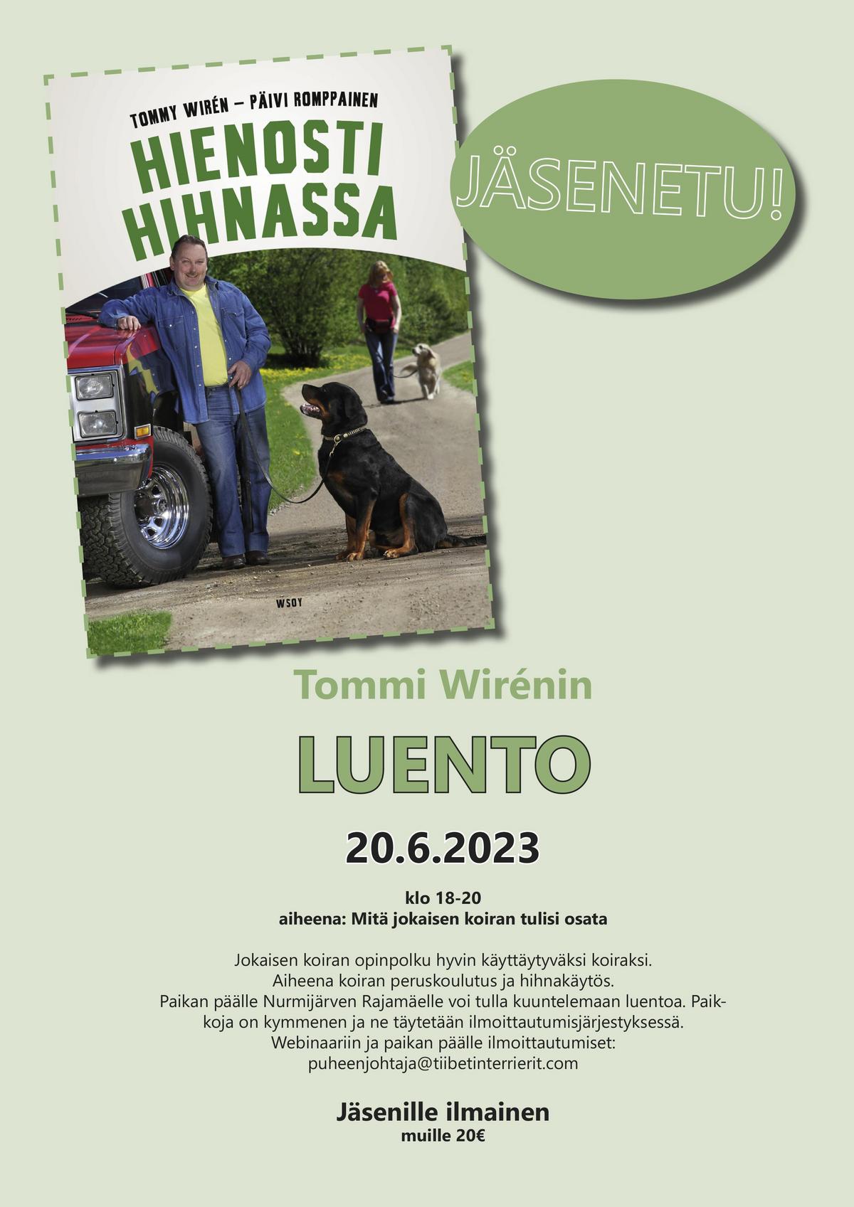 Tommy Wirénin apuun voit luottaa niin koirien kuin muidenkin lemmikkien kanssa. Lähes kolmenkymmenen vuoden kokemuksella ja laadukkaalla ohjauksella syntyy laadukkaita tuloksia.